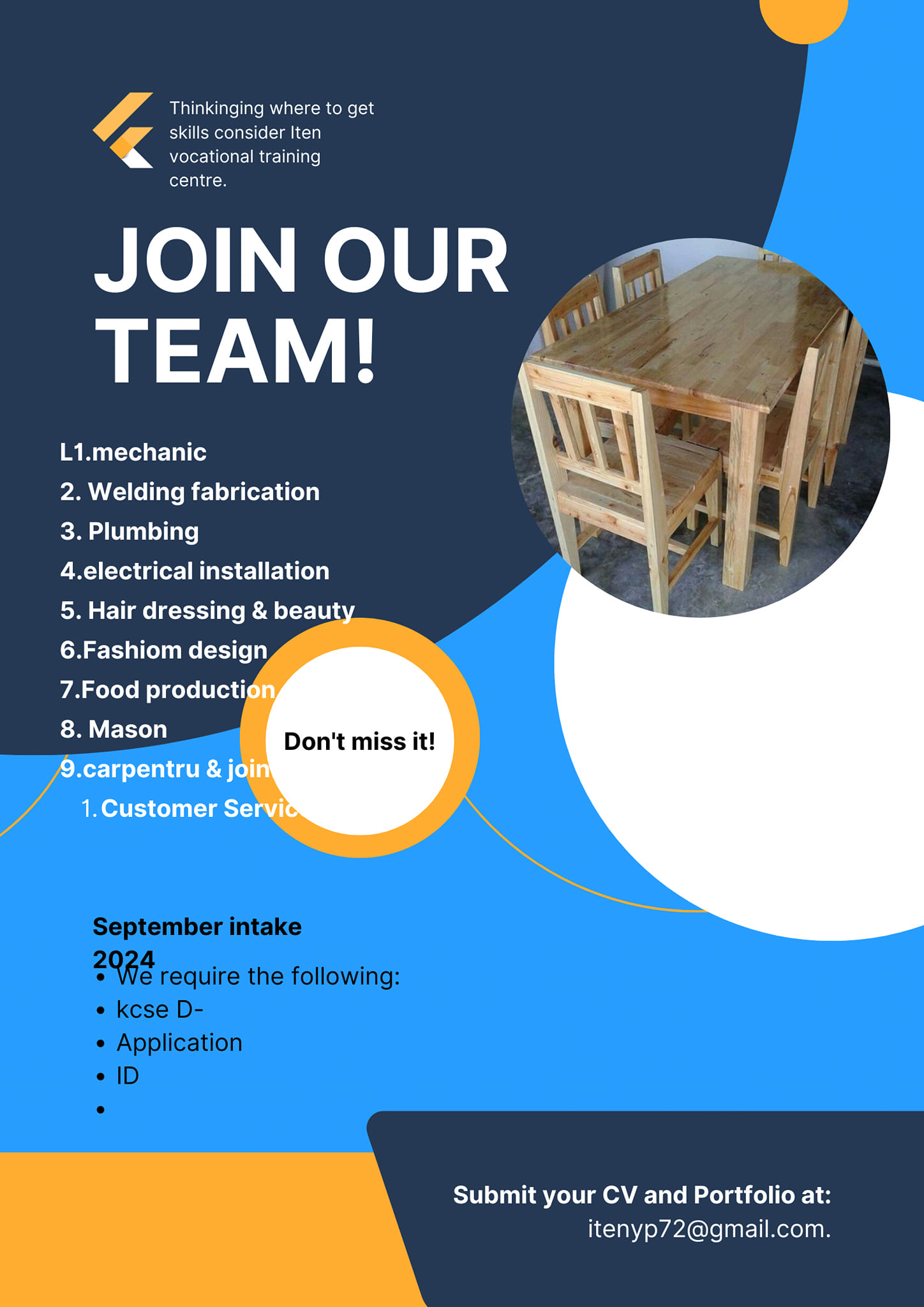 - Apply online: Application – Iten Vocational Training Centre (itenvtc.ac.ke)